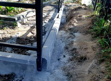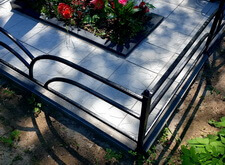 Первым делом мы установили периметр могилы, собранный из бордюрных пролётов. Для этого под оградой была выкопана неглубокая канава, позволяющая надёжно закрепить бетонные плиты в землю. Примыкающие к опорам ограждения блоки были немного подрезаны.